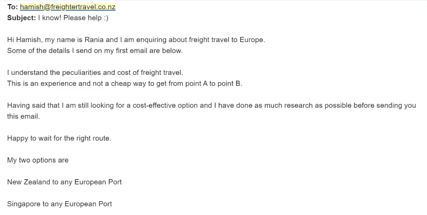 Here is my second email with the headline “I know! Please help!” to Hamish at Freighter Travel, confirming that I am aware that it is a costly and lengthy process but I still want to go ahead with it.